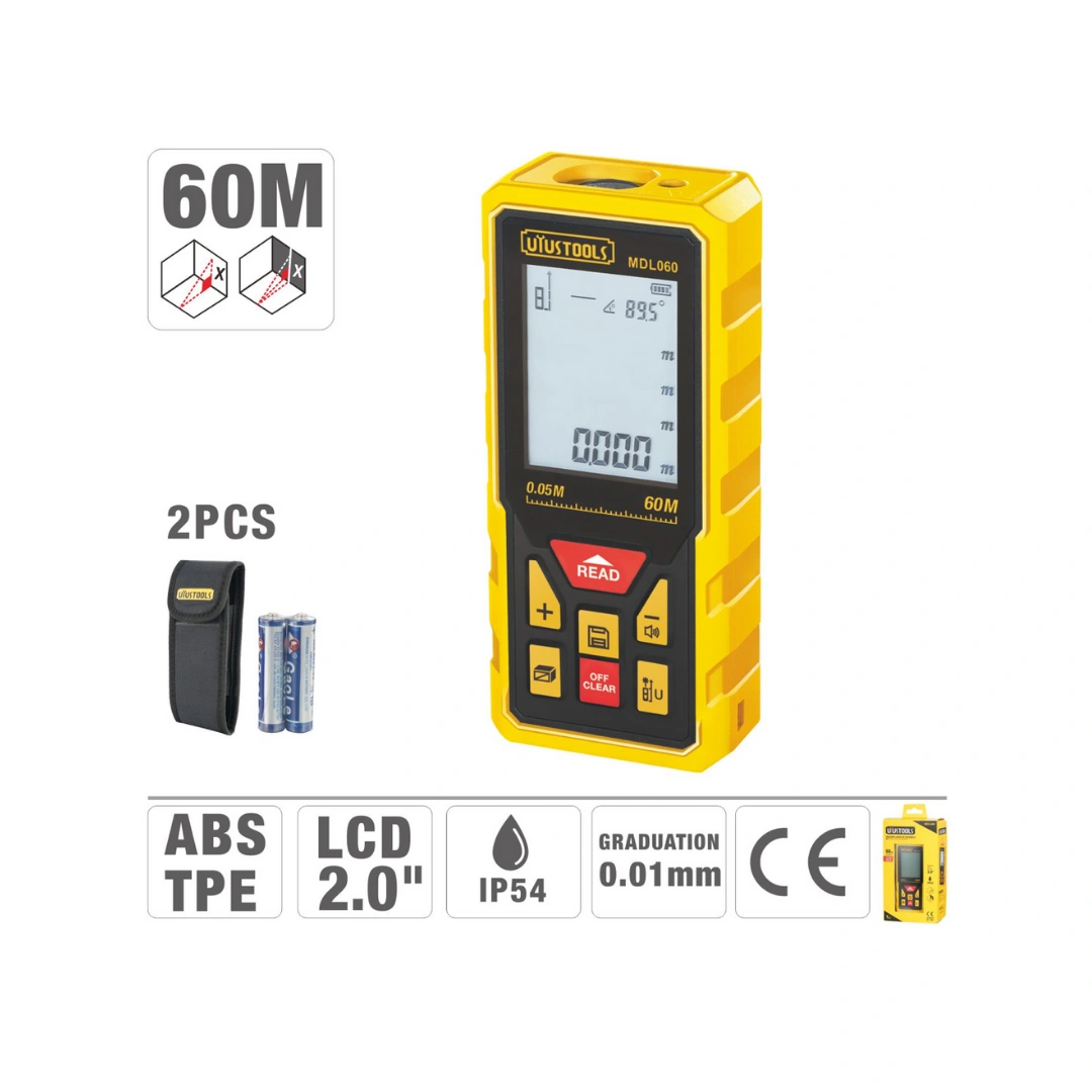 Laser Rojo Distancia de Medición: 60m Unidades de medición: Metros, Pulgadas y Pies. Rango de medición: 0.05m – 60m Protección: IP 54 Precisión: +-2mm Pantalla LCD de 2″.