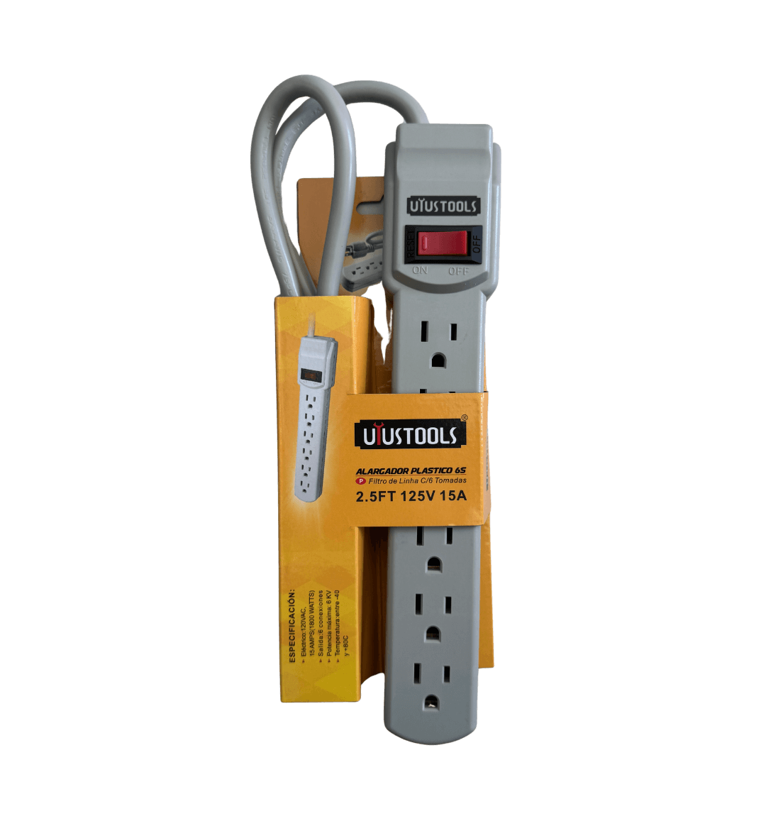 Longitud: 2.5 ft (~0.76 m) Voltaje nominal: 125 V Corriente nominal: 15 A Eléctrico: 120VAC, 15amps (1800 WATTS) Número de tomas: 6 salidas (regleta 6‑en‑uno) Potencia máxima: 6KV Temperatura: entre -40 y +80C