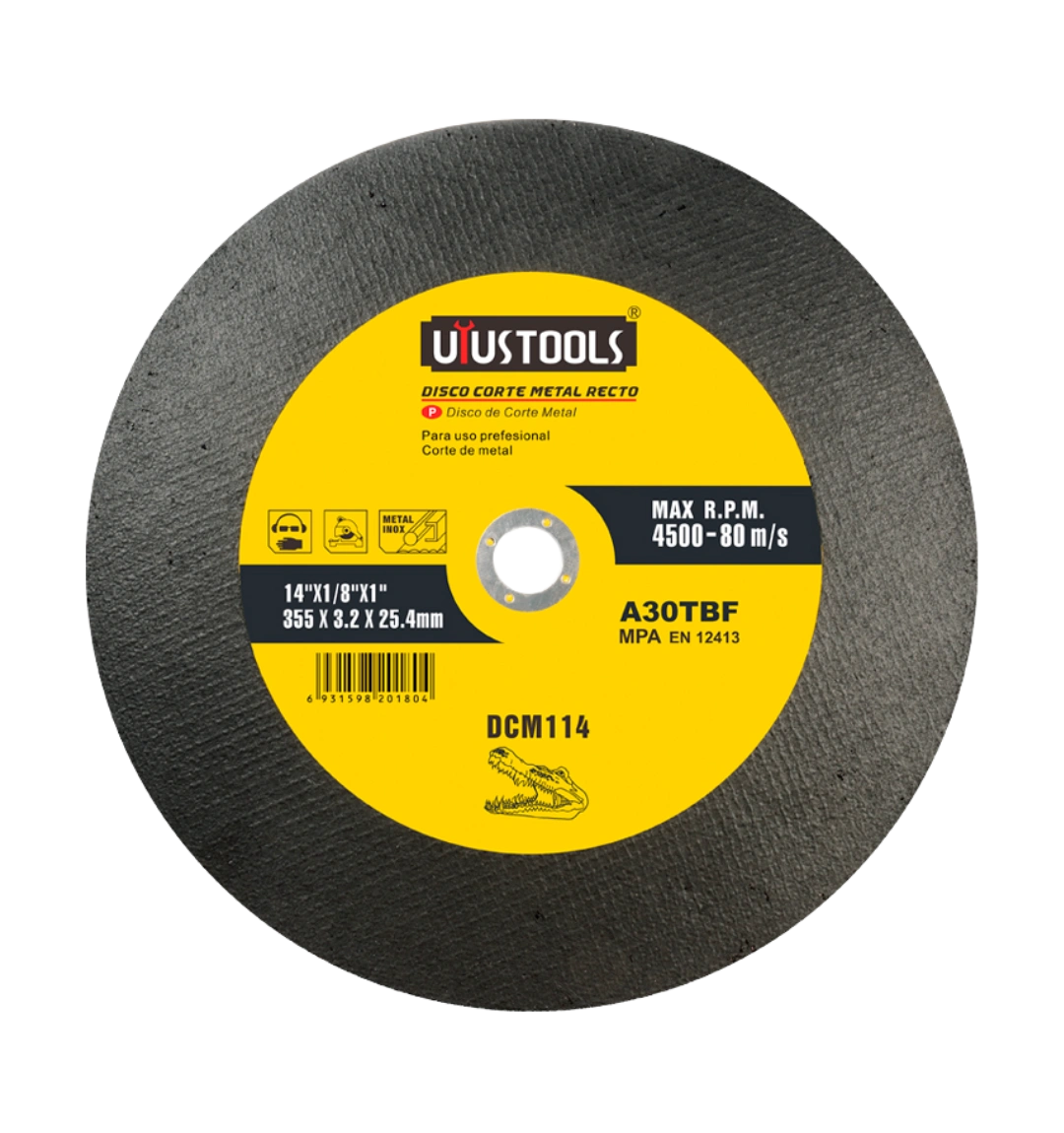 Disco de corte rápido para acero al carbono, hierro, metales estructurales y perfiles delgados. Medidas: 14″ x ⅛» x 1″ (355 x 3.2 x 25.4 mm) MAX R.P.M. 4500-80 m/s Tipo de Grano Abrasivo: A30TBF