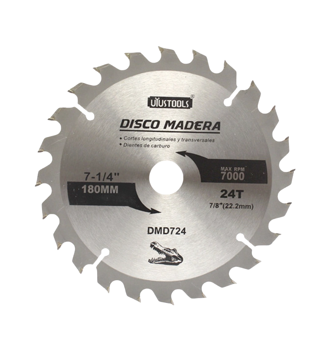 Para cortes rápidos y precisos, cortes longitudinales y transversales. Medidas: 7¼» (184mm) MAX R.P.M. 7000 Cantidad de dientes: 24T Perforación central: 7/8” (22.2 mm)