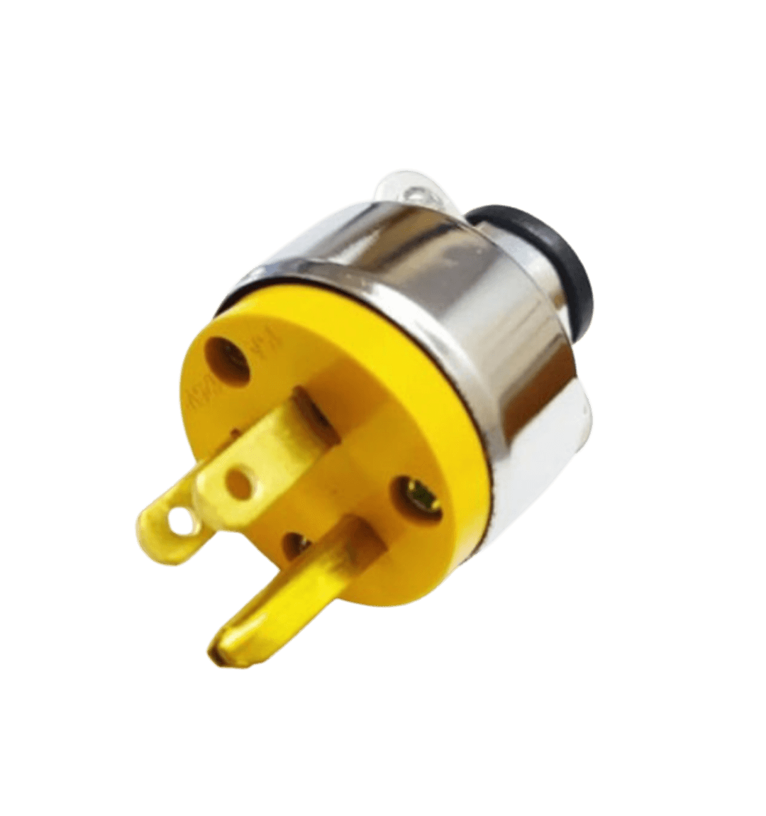 Tipo: Enchufe macho con conexión a tierra (3 pines: dos de fase y uno de tierra). Acabado: Cromado, lo que le otorga resistencia a la corrosión