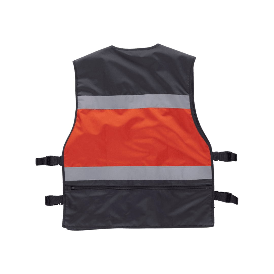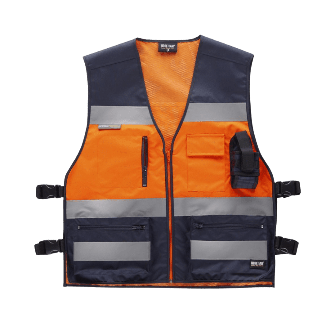 Chaleco en tejido Oxford con ajustes laterales, combinado y con dos cintas reflectivas en pecho y espalda con pieza central de alta visibilidad. Escote a pico y cierre de cremallera de nylon. Un bolsillo con cremallera vertical y un bolsillo de plastón con cartera de velcro en el pecho. Sistema de sujeción especial para emisoras. Dos bolsillos laterales con cinta reflectiva, fuelle y cierre de cremallera. Bolsillo trasero con cierre de cremallera. Hebillas regulables laterales. Ribeteado con bies a contraste. Forro interior de rejilla.