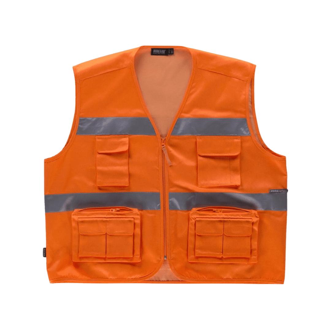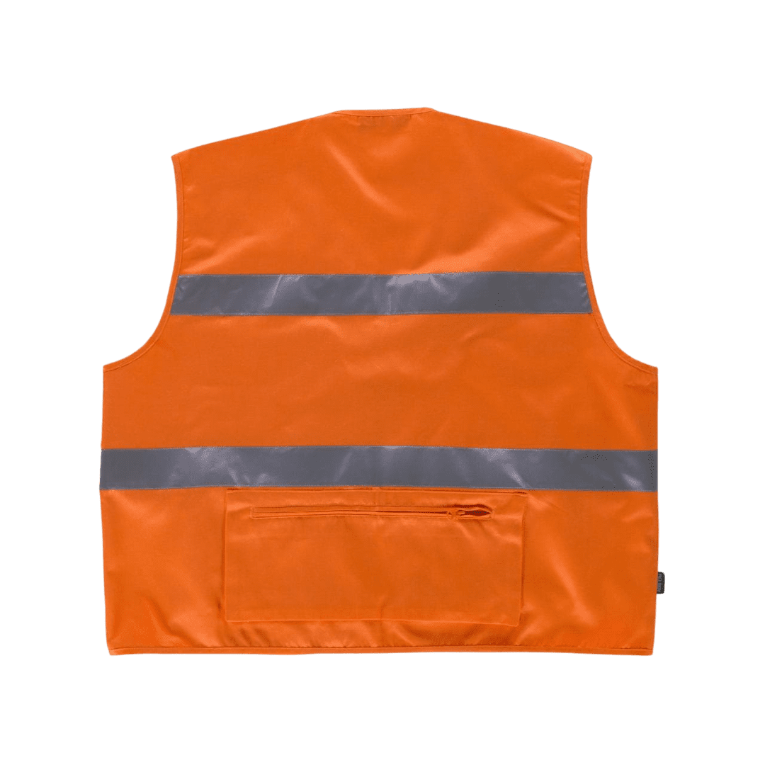 Chaleco tipo safari de alta visibilidad con cintas reflectivas de 5cm en pecho y espalda. Escote a pico y cierre de cremallera de nylon. Dos bolsillos de pecho de distinto tamaño con fuelle y cartera de velcro. Argolla metálica en el bolsillo superior. Dos bolsillos laterales con fuelle y cierre de cremallera. Bolsillos auxiliares superpuestos con cartera de velcro. Un bolsillo trasero con fuelle y cierre de cremallera. Ribeteado con bies.